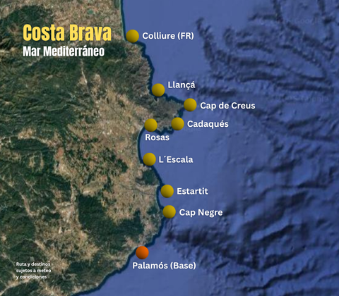 La zona de navegación por la Costa Brava comprende desde Palamós hacia el Norte, pasando por el punto más oriental de la península ibérica, el Parque Natural del Cabo de Creus, hasta llegar a Colliure (Francia).